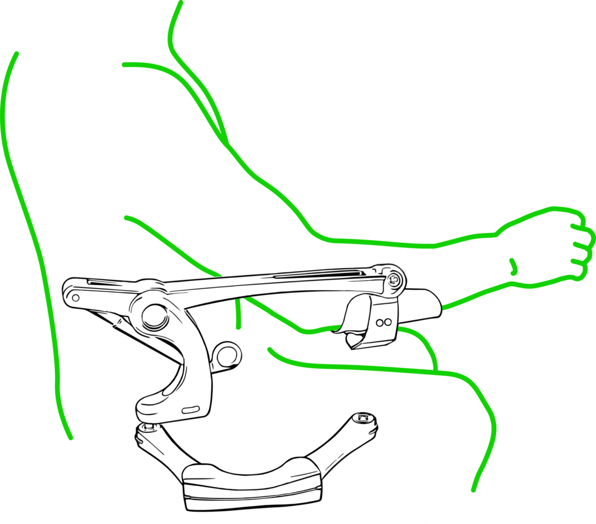 De brace (het gedeelte, waarin de onderarm ligt) is zo ontworpen dat de arm op een natuurlijke manier kan bewegen en in alle standen goed is ondersteund. Deze is in verschillende maten beschikbaar (M, L, XL). Standaard wordt de XL brace geleverd. Andere maten op aanvraag.